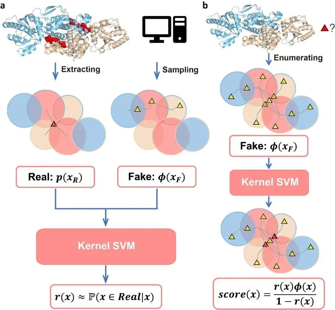 基于以上分析,他们进一步发展了基于蛋白质整体拓扑结构来预测别构位点的方法TopoAlloSite,主要采用噪声对比估计(Noise Contrastive Estimation) 策略来预测别构配体在拓扑图中的位置。为了获取真实数据的分布函数p(x),作者将训练集中复合物拓扑图中的配体节点去除,在每个图中随机加入配体节点生成服从已知分布φ(x)的假图,随后训练kernel-SVM分类器 r(x)以区分真图与假图。真实分布p(x)可从贝叶斯公式推理出(图2a):