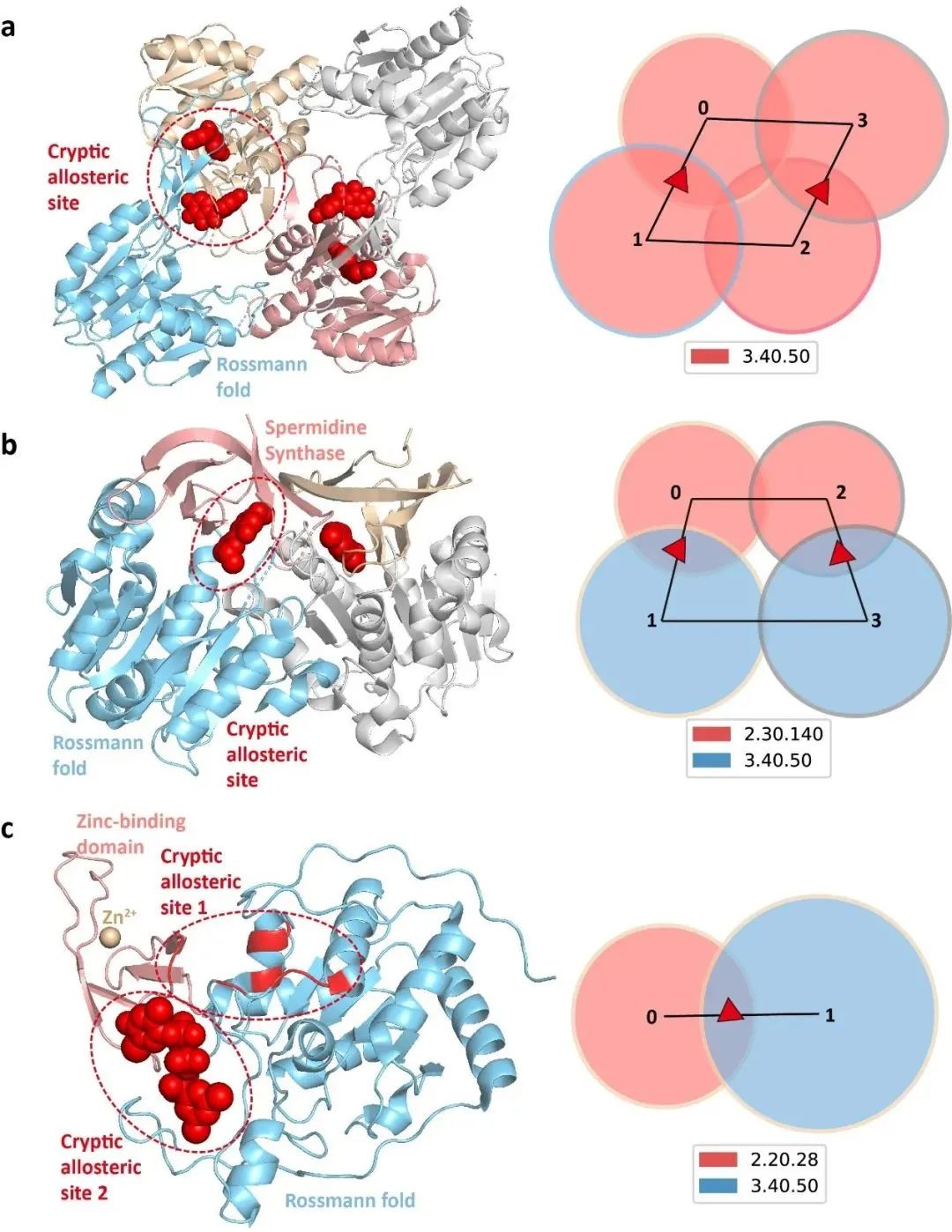 图3. TopoAlloSite对蛋白质中隐藏别构位点的预测结果。(a) CoaBC; (b) SpdSyn; (c) Sirt6