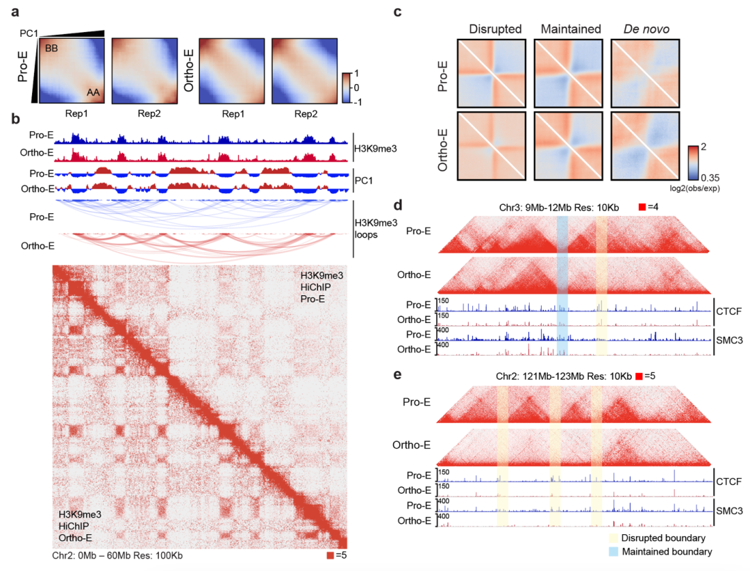 图 2 红细胞终末分化过程中长距离异染色质互作形成(a-b),拓扑相关结构域-TAD瓦解(c-e)