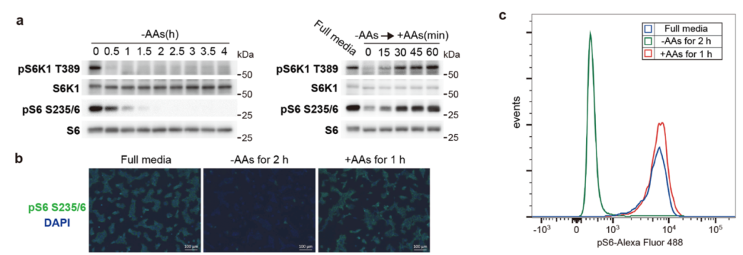 图1. 全基因组CRISPR筛选mTORC1调控蛋白的readout。(a)pS6K1和pS6均能在免疫印迹实验中显示出对氨基酸浓度变化的敏感性;(b)pS6信号在免疫荧光实验中呈现对氨基酸饥饿和再刺激的敏感性;(C)FACS实验证明pS6荧光强度在氨基酸饥饿与再刺激的细胞群之间能够得到良好的区分。