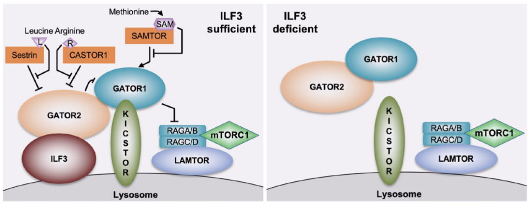 Rag GTPase在感知氨基酸信号后直接募集mTORC1到溶酶体表面【5,6】。为了验证ILF3是否也是通过此路径调控mTORC1,作者首先通过基因敲除及溶酶体亲和纯化手段证明了ILF3在Rag GTPase的上游发挥着调控mTORC1溶酶体移位的功能。后续ILF3与Rag GTPase上游的多个已知关键节点的上位分析实验显示ILF3在GATOR复合体的下游调控mTORC1。为了进一步探索ILF3调控mTORC1的分子机制,作者用免疫共沉淀检测了ILF3是否可能与mTORC1感知氨基酸过程中的关键调控蛋白或蛋白复合体之间有相互作用。由此,作者发现ILF3能以一种氨基酸不敏感的方式结合GATOR复合体。进一步的研究发现ILF3本身有部分定位于溶酶体,并且能将GATOR复合体靶定在溶酶体表面,由此阐释了ILF3的对mTORC1信号的调控机制(图2)。