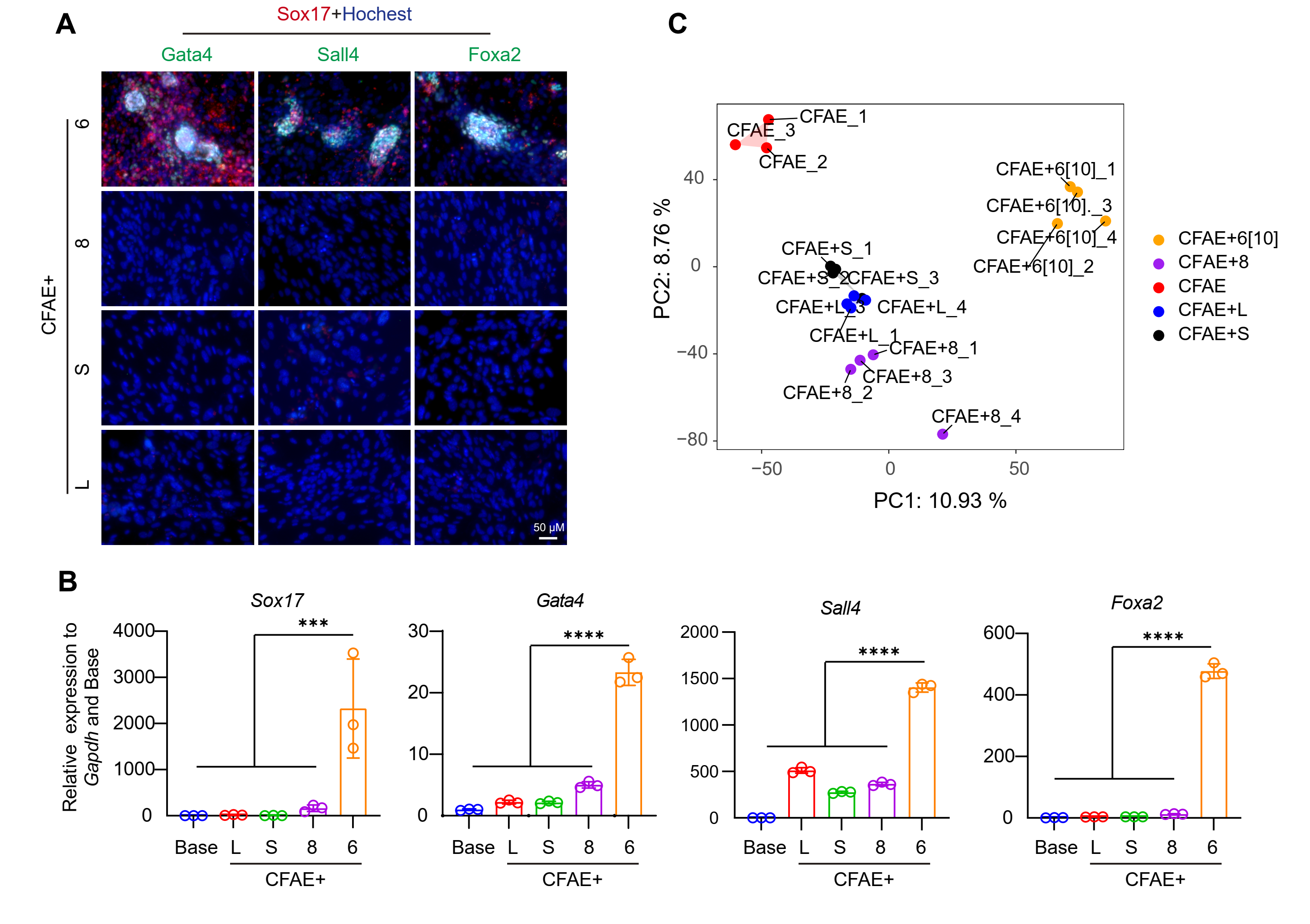 化学小分子可以将体细胞重编程为多潜能干细胞(CiPS细胞),使其具有向多种细胞类型分化的能力。进一步报道表明,小鼠成纤维细胞重编程为CiPS细胞过程中,会经历一个化学激活的多谱系待发(CaMP, chemically activated multi-lineage priming)状态1,然后转化为胚外内胚层(XEN, extraembryonic endoderm)样细胞2,并最终重编程为多能干细胞(PSC)。然而有意思的是,这一过程中对于CaMP状态、XEN样细胞和CiPS细胞诱导都不可或缺的一种Alk5抑制剂E-616452并不能被其它的Alk5抑制剂替代,其下游作用机制还很不清楚。