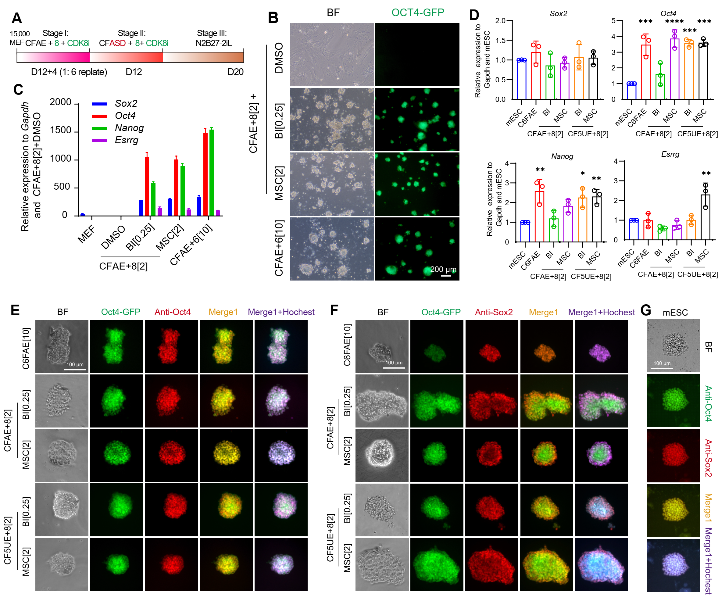 在这些候选小分子中,和E-616452相似性最高的小分子是MSC2530818,一个CDK8的抑制剂。激酶抑制实验显示,E-616452和MSC2530818均能显著抑制CDK8的活性(IC50分别为428nM和1.12nM),而Alk5同靶点的小分子抑制剂A83-01则几乎不能抑制CDK8(IC50为4277nM)(图3A),提示E-616452在CiPS细胞诱导中的特殊作用可能是抑制CDK8的活性。进一步,采用CDK8的另一小分子抑制剂BI-1347,或者通过遗传学手段敲低CDK8均有与E-616452类似的诱导重编程的效果——不仅在诱导早期它们能显著激活XEN-like标志基因(Sox17、Sall4、Gata4、Foxa2)的表达(图3B和C),而且能够最终支持CiPS细胞的诱导(图4)。