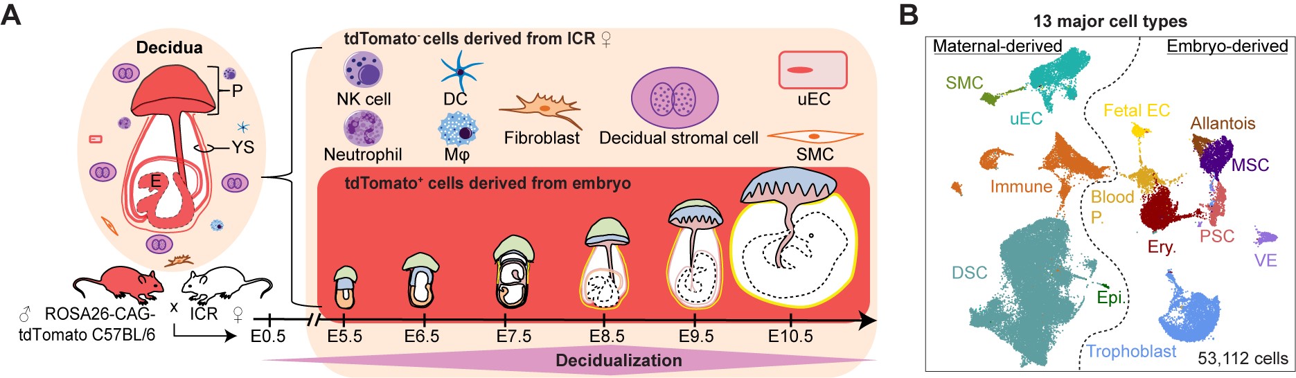 作者首先对健康小鼠妊娠早期(E5.5-E10.5)着床位点的蜕膜组织和胚外组织进行单细胞转录组测序,对母体和胚胎来源的细胞类型 (共53,112个细胞)进行系统定义 (图1)。同时对蜕膜基质细胞(Decidual stromal cells, DSCs)、免疫细胞、母体来源的血管内皮细胞和滋养层细胞进行亚群定义,描述了细胞亚群比例随蜕膜过程的动态变化。研究人员联合使用免疫荧光染色和asmFISH技术初步勾勒出蜕膜基质细胞的空间分布。