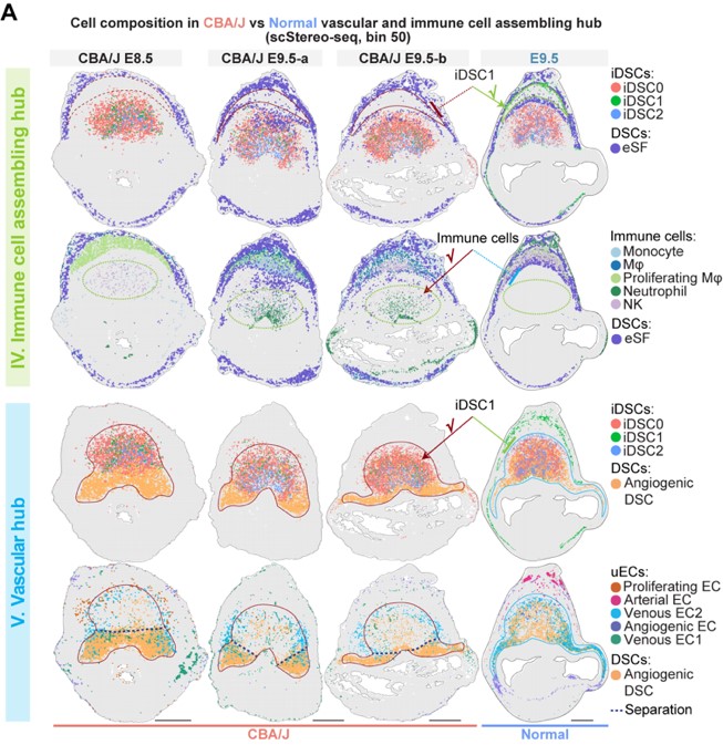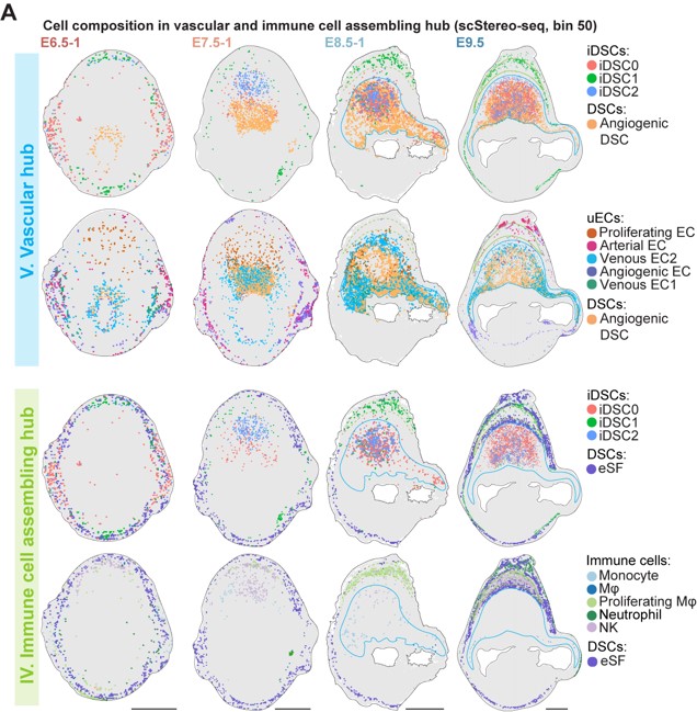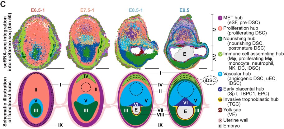 作者使用华大基因组开发的Stereo-seq技术,对小鼠妊娠早期E6.5-E9.5着床位点进行空间转录组测序。结合单细胞转录组和空间转录组测序结果,本文首次鉴定出着床位点的由蜕膜组织细胞、免疫细胞、血管内皮细胞和滋养层细胞等所组成的8个功能中心 (functional hub, hub I-VIII)。其中,功能中心I至III主要由蜕膜基质细胞构成,是蜕膜化过程的主要发生区域;功能中心IV(免疫招募中心)富含免疫细胞;而功能中心V(血管生成中心)则富集血管内皮细胞和血管生成相关的蜕膜细胞亚群 (图2)。功能中心的细胞比例和空间位置分布随时间的动态变化代表妊娠过程中关键生物学事件的发生。