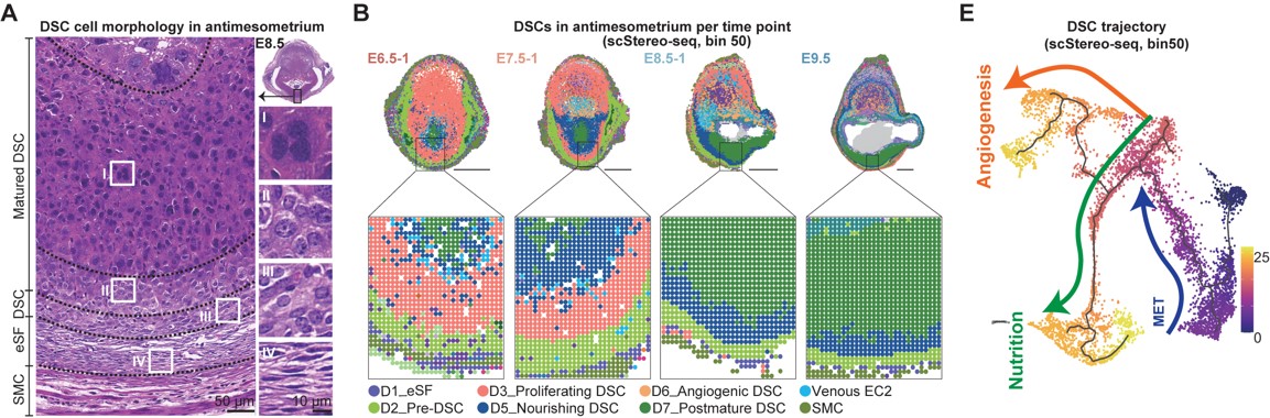 2023年9月11日,北京大学杜鹏课题组在Cell杂志在线发表了题为“Spatiotemporal insight into early pregnancy governed by immune-featured stromal cells”的研究论文。在这项研究中,作者结合使用单细胞转录组和华大单细胞空间转录组技术[8]首次对小鼠妊娠早期(E5.5-E9.5)着床位点的细胞组成进行了详细定义,并根据不同细胞的空间动态分布,鉴定出妊娠早期着床位点的8个不同功能中心,最终通过比较健康小鼠和复发性流产模型小鼠着床位点功能中心的差异,进而揭示了胚胎着床初期蜕膜微环境建立及稳态维持是成功妊娠至关重要的条件。