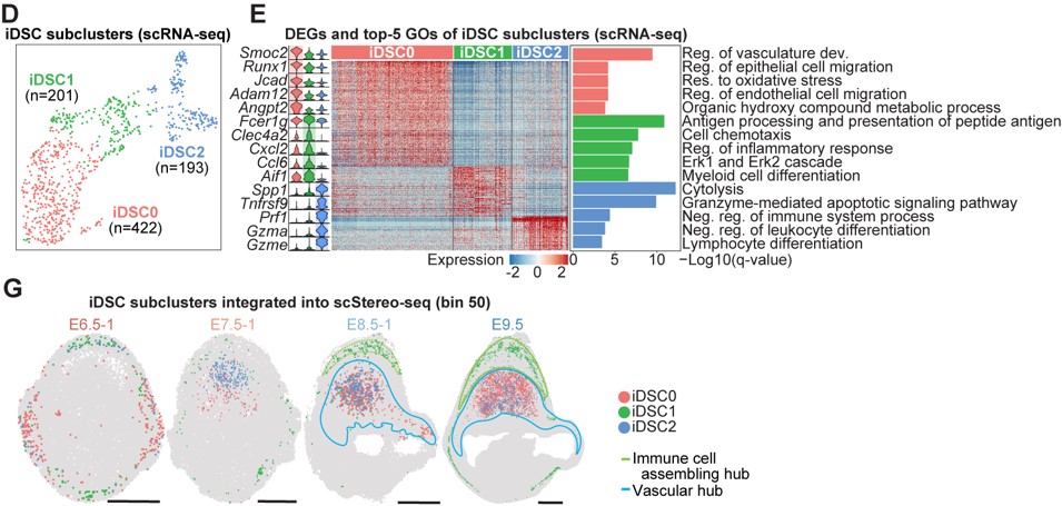 研究者在对细胞进行亚群分析过程中,发现一群特殊的蜕膜基质细胞亚群,整体转录组与血管生成相关的DSC亚群相似。基因富集分析发现,该群细胞高表达免疫活动相关基因(如Cxcl2, Ccl6, Gzma/e, Tnfrsf9和Spp1等),通路富集分析显示具有“白细胞增殖”和“抗原呈递”的功能。因此,将其命名为iDSC(immune-featured DSC)。随后,进一步基于转录组差异分为3个亚群: iDSC0/1/2,结合空间转录组数据Stereo-seq, 免疫荧光染色和ISS(in situ sequence)结果显示该三个亚群随着妊娠过程呈现不同的空间定位,并最终在E8.5之后分布于免疫招募和血管生成中心。其中iDSC0高表达与血管发育相关的基因(如: Angpt2, Runx1, Jcad 和 Adam12);iDSC1亚群高表达炎症反应相关基因(如: Clec4a2, Cxcl2, Ccl6 和Aif1);iDSC2高表达细胞溶解和凋亡相关的基因(如: Prf1, Gzma/e, Tnfrsf9 和Spp1)。空间定位上,iDSC0和iDSC2主要位于血管生成中心,iDSC1位于免疫招募中心(图4)。综合iDSC亚群分子特征和空间定位,由此推测,iDSC三个亚群分别在免疫反应和血管生成等生物学活动中扮演重要角色。