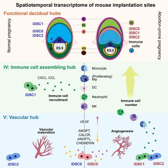 最后,作者通过比较健康小鼠和复发性流产小鼠模型的着床位点细胞转录组和空间位置分布差异发现,iDSC三个亚群相较于其他蜕膜基质细胞亚群具有更强的功能失调表型,包括免疫招募通路的趋化因子表达上调,以及血管成熟信号下调。同时iDSC1亚群异常定位于血管生成中心,导致免疫细胞异常富集在血管生成中心,致使血管生成过程异常 (图6)。由此推测,空间定位和分子异常的iDSC致使着床位点的功能中心特化失败,并最终导致妊娠失败。