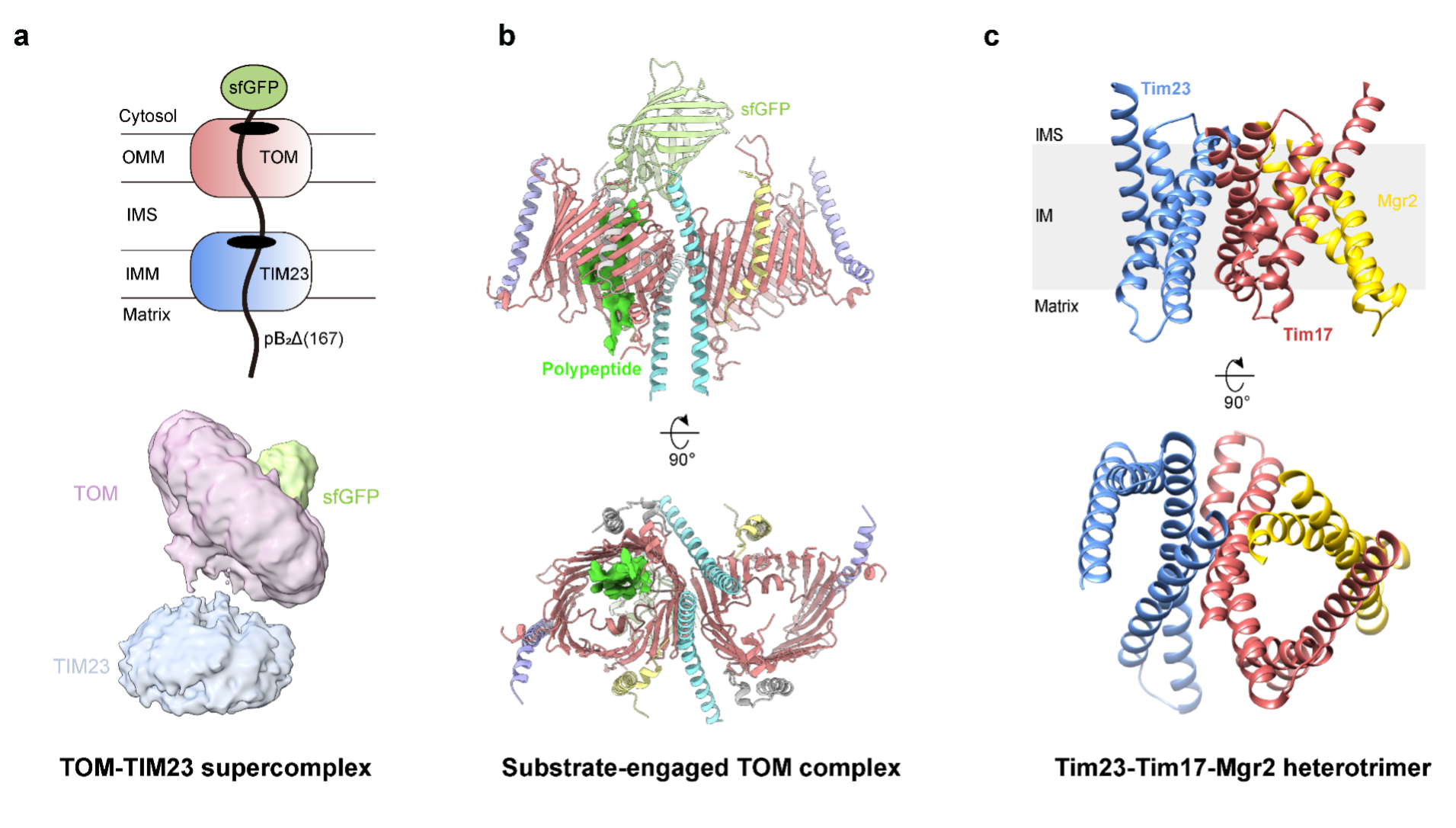图1. TOM-TIM23超级复合物的结构。(a) TOM-TIM23超级复合物的组装示意图和冷冻电镜结构。(b)包含蛋白质底物的TOM复合物的冷冻电镜结构模型。(c) Tim17-Tim23-Mgr2异源三聚体的AlphaFold2结构模型。