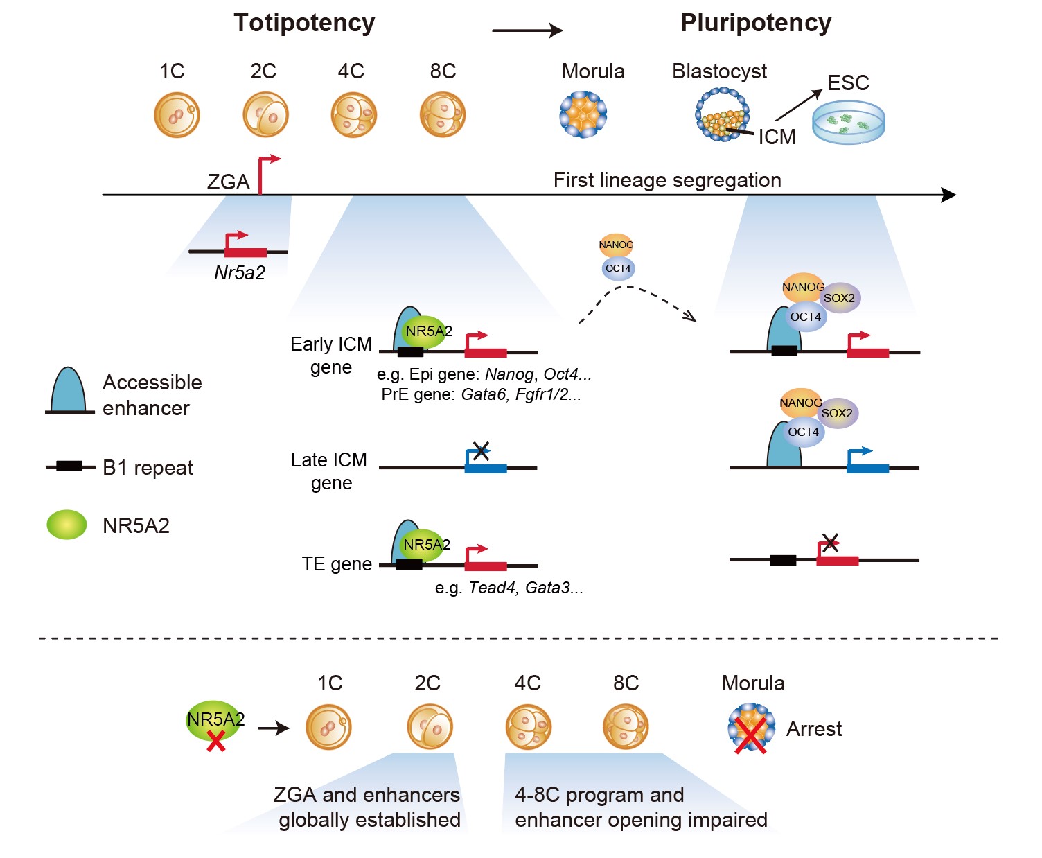 2023年11月7日,生命中心颉伟研究组在《细胞研究》期刊上以长文形式报道了题为《NR5A2在全能性胚胎中连接合子基因组激活与第一次谱系分化》(NR5A2 connects zygotic genome activation to the first lineage segregation in totipotent embryos)的研究论文,揭示了转录因子是如何连接受精卵的合子基因组激活与第一次谱系分化。这一重要发现阐明了早期胚胎发育全能性向多能性转换的功能与机制。