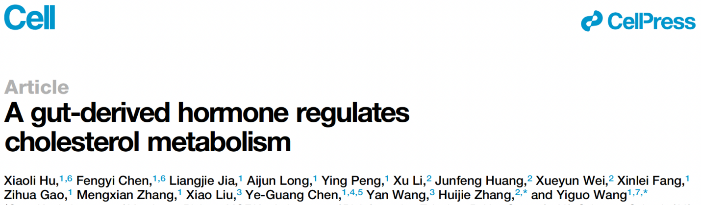 2024年3月18日,生命中心王一国团队与南方医科大学南方医院张惠杰团队在《细胞》(Cell)杂志在线发表了题为“一种肠源激素对胆固醇代谢的调控”(A gut-derived hormone regulates cholesterol metabolism)的研究论文,首次发现并命名了一种肠道激素Cholesin(肠抑脂素),揭示了Cholesin调控机体胆固醇稳态的作用和机制。