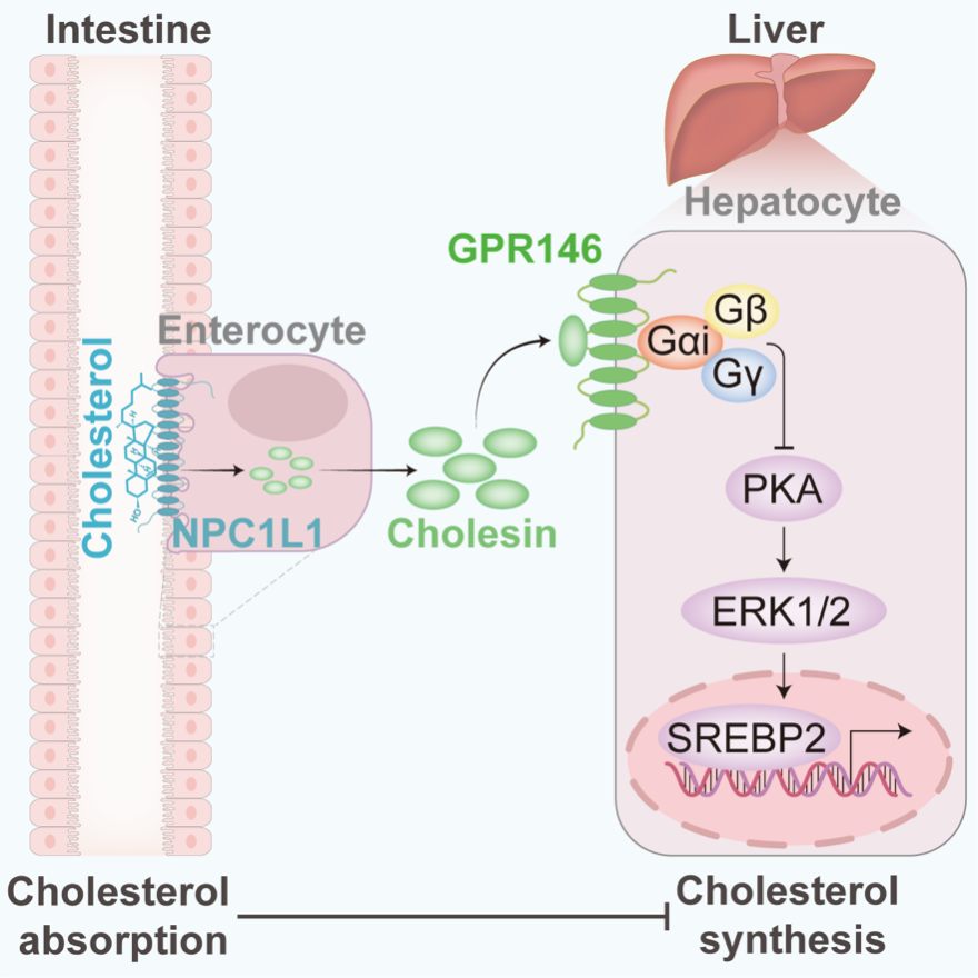 机体的胆固醇稳态由各种组织相互协调,以保持外源胆固醇吸收、内源胆固醇从头合成以及胆汁清除和外排之间的平衡。血液中胆固醇水平升高,尤其是低密度脂蛋白胆固醇(LDL-C)水平升高,是引发动脉粥样硬化等心脑血管疾病的重要风险因素。他汀类药物、PCSK9抑制剂等心脑血管疾病一线用药也主要通过降低LDL-C发挥功能1。外源胆固醇的吸收增加会抑制内源胆固醇的合成,而外源胆固醇摄入不足会激活内源胆固醇的合成。胆固醇自身作为信号分子通过抑制SCAP-SREBP复合体活性负反馈调节细胞的胆固醇合成2。小肠是外源胆固醇吸收的场所,肝脏是内源胆固醇合成的主要器官,肠道胆固醇吸收和肝脏胆固醇合成之间是否存在独立于胆固醇的调节通路尚不清楚。