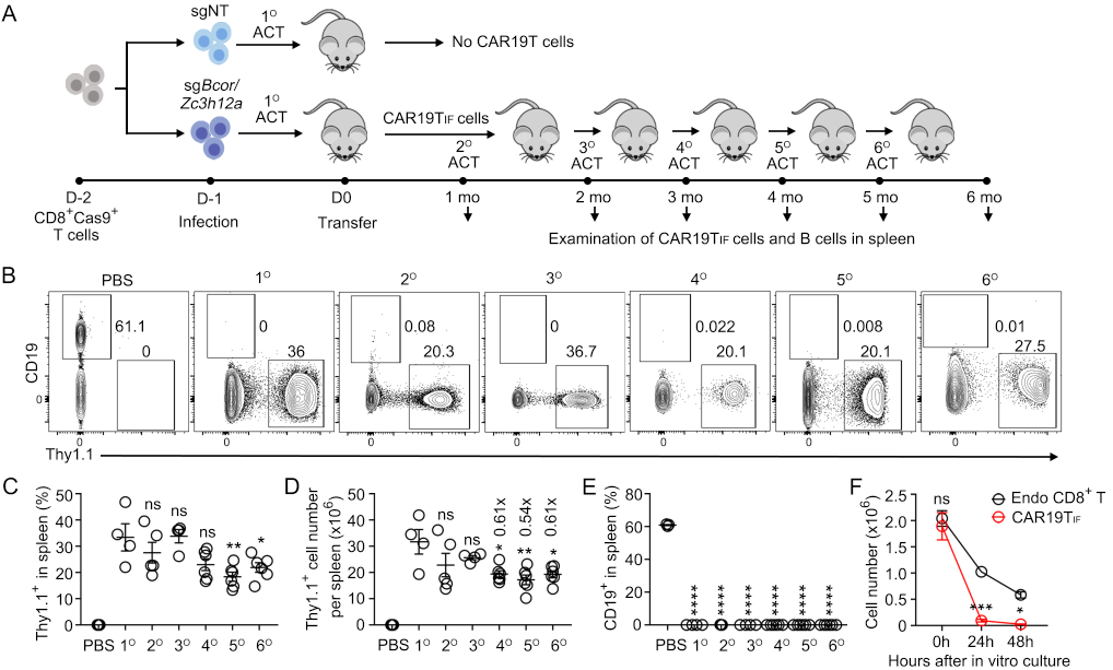 (A)CAR19TIF连续传代实验流程图。(B) 流式细胞术检测CAR19TIF在小鼠体内的比例以及对靶细胞的杀伤。(C-D) 小鼠脾脏中CAR19TIF的比例和数量统计结果。(E) 小鼠脾脏中靶细胞比例的统计结果。(F) 体外培养的CAR19TIF细胞数量统计结果。