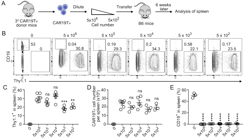 (A) 过继移植不同数量CAR19TIF实验流程图。(B) 流式细胞术检测不同数量CAR19TIF在小鼠体内的重建结果以及对靶细胞的杀伤。(C-D) 小鼠脾脏中CAR19TIF的比例和数量统计结果。(E) 小鼠脾脏中靶细胞比例的统计结果。