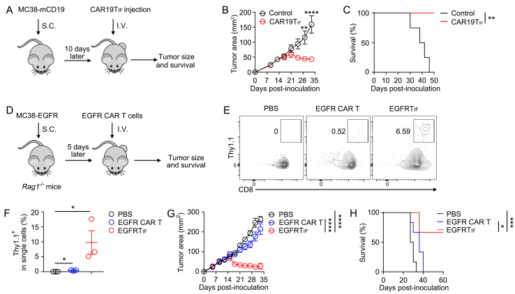 CAR19TIF表现为CD44hiCD62LhiPD-1hiCX3CR1hiFSClow,同时具备干性和功能性的特征,这与之前报道的长寿命T细胞,包括记忆性T细胞(TCM),干细胞样记忆性T细胞(TSCM)以及耗竭前体T细胞(TPEX)等均有显著差异。此外,CAR19TIF和近期报道的ISTC(CD62LnegTCF1intTIM-3hi)也有明显差异。因此,TIF代表了一种全新的T细胞状态。其中,CAR19TIF的细胞大小(cell size)显著小于初始T细胞(naïve T cells)这一特征是所有其它T细胞都不具备的。与其细胞大小对应,CAR19TIF在清除靶细胞后进入一种代谢冬眠的状态,其营养物质的摄取和代谢活性显著低于初始T细胞。这打破了长寿命T细胞线粒体活性增加这一常见观点,进一步显示出CAR19TIF的不同之处。 在各种肿瘤模型中,基于TIF的CAR T细胞均表现出了显著的抗肿瘤效应,并延长小鼠的生存时间(图3)。最后,TIF也可在人的T细胞中诱导,并表现出和小鼠TIF细胞类似的特征。 图3.CAR19TIF和EGFRTIF具有显著的抗肿瘤功能 (A)CAR19TIF治疗肿瘤实验流程图。(B) 肿瘤大小统计结果。(C) 荷瘤小鼠生存曲线。(D)EGFRTIF治疗肿瘤实验流程图。(E,F)流式细胞术检测荷瘤小鼠外周血中EGFR CAR T细胞比例。(G) 肿瘤大小统计结果。(H) 荷瘤小鼠生存曲线。 总之,该研究发现了一种全新的T细胞状态(图4),TIF。TIF具备类似于iPSCs那样接近于无限的自我更新能力,同时完整保留了成熟T细胞的生理功能,具有重要的理论和应用价值。 图4. TIF细胞诱导模式图 彭敏为该论文通讯作者,课题组博士后王丽霞、金刚(彭敏实验室2017级博士生)和周秋萍为该论文共同第一作者,2020级博士生刘岩岩也为该论文做出了重要贡献。感谢该项目中人CAR T细胞制备过程中生命中心林欣实验室的提供的技术帮助,同时感谢清华大学董晨实验室提供的电转仪。该研究获得了国家自然科学基金委员会、万科基金、清华大学笃实项目、生命科学联合中心、山西医科大学-清华大学医学院前沿医学协同创新中心、清华大学免疫学研究所、分子肿瘤学全国重点实验室等资助。彭敏课题组长期致力于T细胞基础和应用研究,欢迎博士生和博士后加入!有意者请联系pengmin@tsinghua.edu.cn。 原文链接:https://doi.org/10.1084/jem.20232368