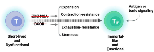 2024年3月26日,生命中心PI、清华大学基础医学院彭敏副教授团队在《Journal of Experimental Medicine》杂志发表题为“Induction of immortal-like and functional CAR T cells by defined factors”的研究论文。该研究报道了一种全新的T细胞状态,即类永生化功能性T细胞(Immortal-like and Functional T cells),简称TIF。TIF具备类似于诱导多功能干细胞(iPSCs)那样接近于无限的自我更新能力,同时完整保留了成熟T细胞的生理功能,具有重要的理论和应用价值。