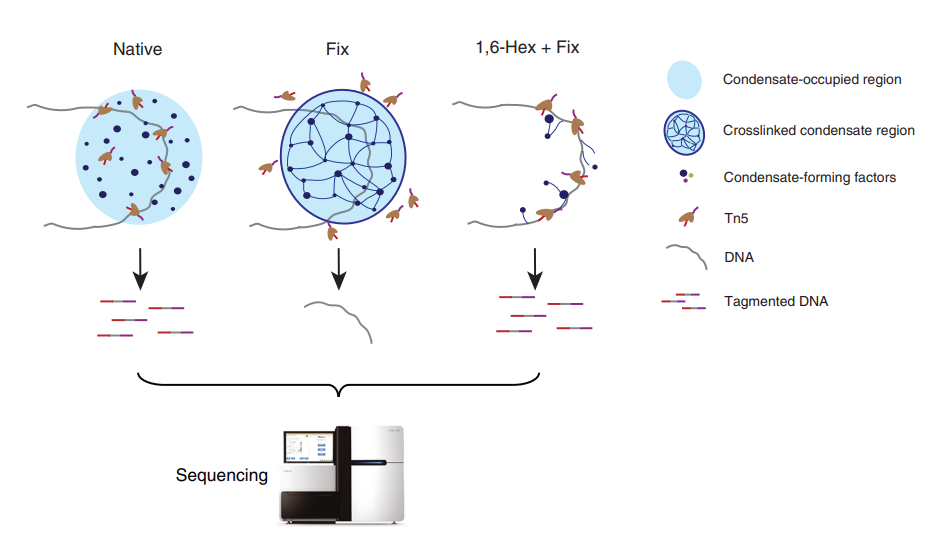 ACC-Seq技术是基于以下原理:在基因组中,那些没有凝聚体结合的区域,即使经过1,6-己二醇处理,其染色质可及性(由ATAC-seq评估)也基本保持稳定。然而,在凝聚体结合的区域,由于1,6-己二醇破坏了凝聚体,染色质的可及性会发生变化。通过对这些变化进行对比分析,能够识别出基因组中哪些位置被转录凝聚体占据。