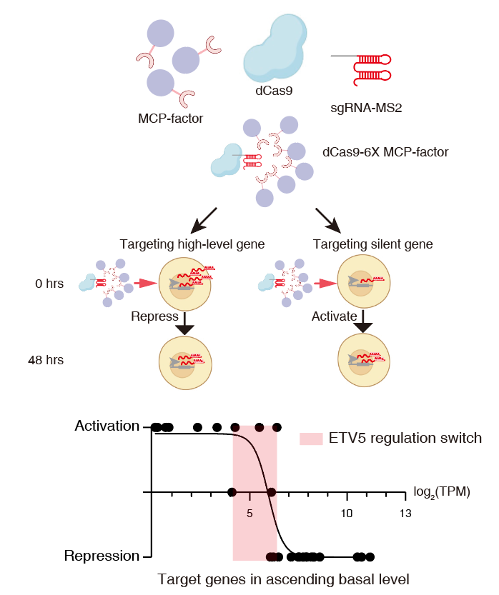 通过运用ACC-Seq技术,研究者们在小鼠胚胎干细胞(mESC)中识别出了一组具有相分离能力的转录因子,这些转录因子被称为双效转录因子(dual-action TFs),其中包括ETV5等。值得注意的是,当这些dual-action TFs发生相分离时,它们虽然与转录的核心组分RNA聚合酶II(Pol II)有一定的亲和性,但与其他活化组分如MED1之间则可以表现出较低的亲和性。深入的研究揭示,这种差异性的亲和性使得dual-action TFs在调控基因表达上具有双效的调控功能:在高表达基因处,它们起到抑制作用;而在沉默的基因区域,则能激活这些基因。