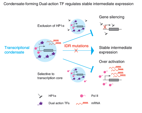 综合上述发现,这项研究揭示了一类具有相分离能力的dual-action TFs,它们通过选择性地招募转录核心组件,实现其独特的双效转录调节功能。这些发现不仅为探索相分离现象与转录调控之间的联系提供了新的理解,也为中等水平的基因表达及其维持机制提出了新的见解。