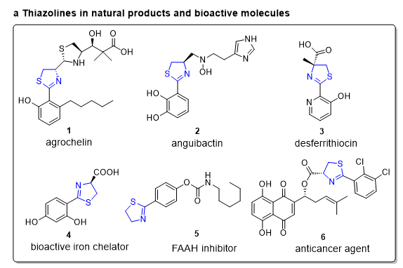 含氮杂环不仅在天然产物中随处可见,同时也是药物分子最为常见的结构之一。其中,噻唑啉结构被发现是一类天然铁载体的核心骨架,某些病原菌可以通过分泌这类铁载体来从宿主细胞中摄取铁元素从而产生毒力。受此启发,噻唑啉化合物被广泛应用于输血性铁过载疾病的药物研发,同时该类化合物还被发现具有抗肿瘤、抑制脂肪酸酰胺水解酶等生物活性。此外,噻唑啉化合物在食品工业、农药和材料化学等领域也有广泛的应用。然而,传统的噻唑啉化学合成方法通常需要高温回流的剧烈条件,或者使用价格昂贵的金属催化剂,合成效率低且具有很大的底物局限性。
