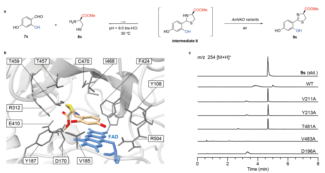 酶催化由于其催化效率高、反应选择性好、条件温和、环境友好等优势,在有机合成的研究领域越来越受到重视。微生物来源的香草醇氧化酶(Vanillyl Alcohol Oxidases, VAOs)具有化学特异性的苄位氧化能力,在自然界中能够将香草醇氧化为香草醛。基于VAOs的催化特性,北京大学化学与分子工程学院雷晓光团队在Angew. Chem. Int. Ed.杂志上报道了首例噻唑啉的化学酶法合成方法。在该方法中,4-羟基苯甲醛和2-氨基硫醇在水溶液首先中通过缩合反应产生微量的噻唑烷中间体,随后VAOs选择性地氧化该中间体从而生成最终的噻唑啉产物。该方法不仅首次实现了直接从醛出发的噻唑啉一锅法合成,同时拓展了VAOs“新于自然”(new to nature)的催化活性。该化学酶法合成策略具有条件温和,环境友好等优势,可以被应用于含氮杂环药物分子的工业化合成。