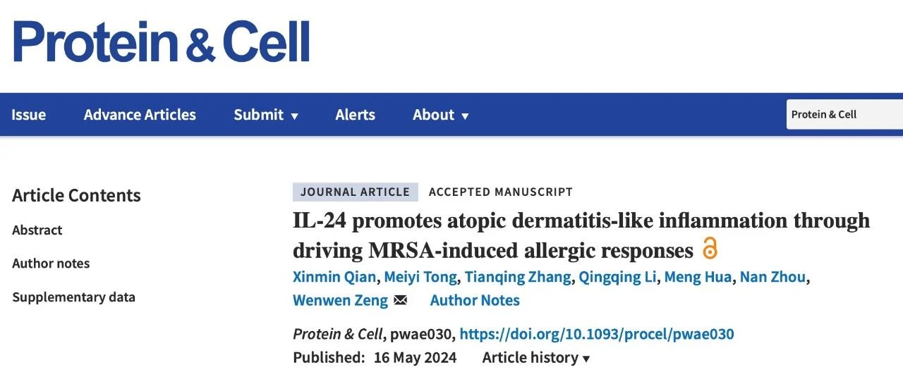 生命中心曾文文课题组在Protein & Cell杂志发表题为IL-24 promotes atopic dermatitis-like inflammation through driving MRSA-induced allergic responses的研究论文