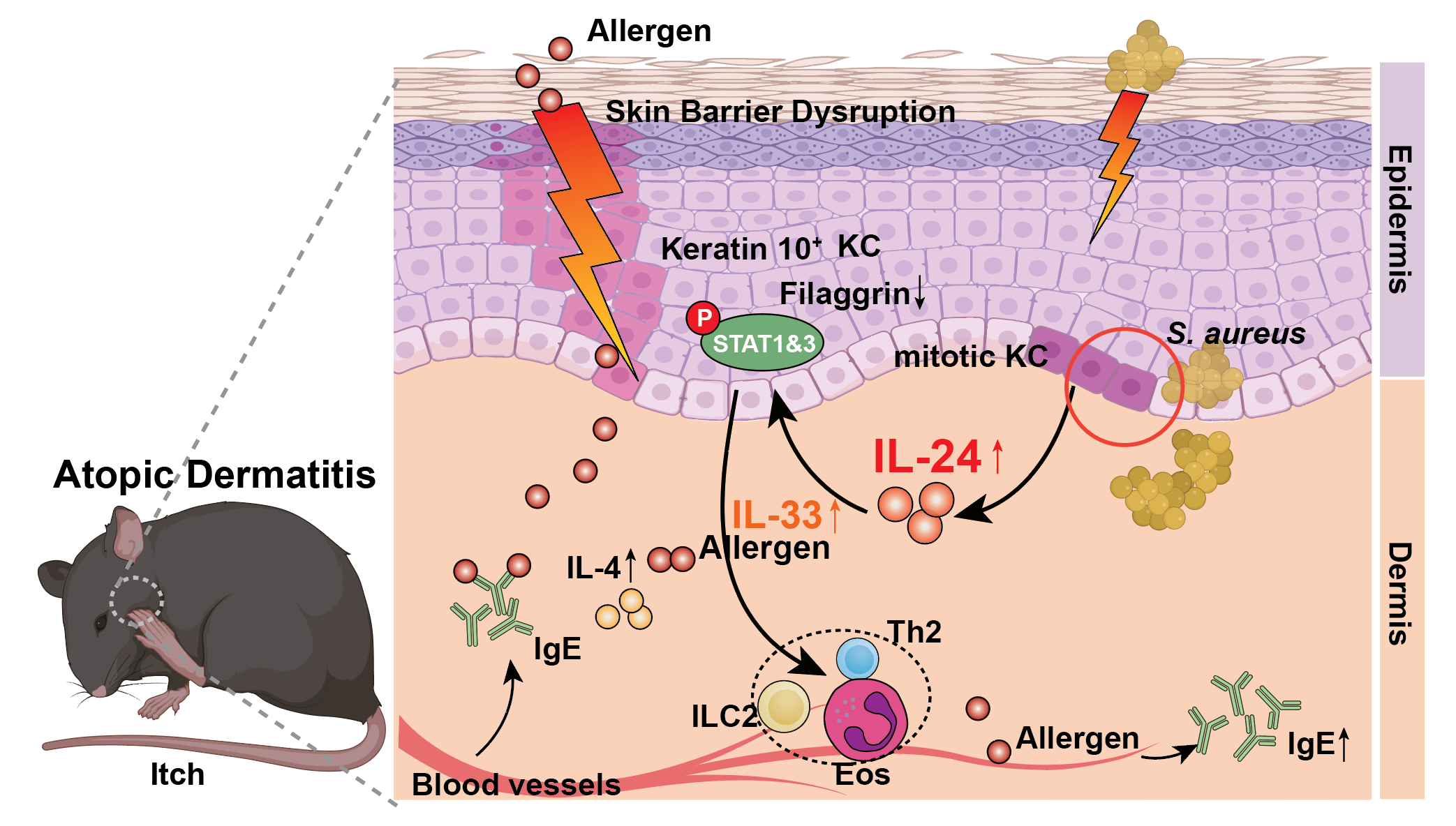 图 1. S. aureus刺激表皮基底层KC产生IL-24,作用在分化的KC上,通过JAK-STAT-IL-33驱动2型免疫反应,促进AD发展。