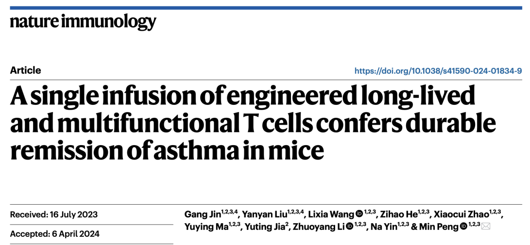3. Gang Jin, et al., A single infusion of engineered long-lived and multifunctional T cells confers durable remission of asthma in mice. Nature Immunology, 2024.