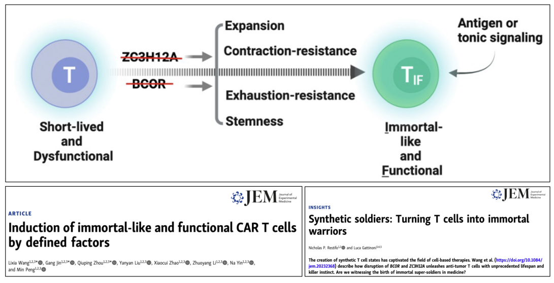 为了解决CAR-T细胞疗效持久性和化疗预处理问题,彭敏团队首先以临床上最常用的CD19 CAR-T细胞为模型,通过全基因CRISPR筛选发现了基因组中一个特殊的基因组合,即BCOR和ZC3H12A。敲除这两个基因使得CAR-T细胞进入一种全新的状态,被命名为“类永生化功能性”T细胞(Immortal-like and Functional T cells,简称TIF)。CARTIF细胞具备类似于诱导多功能干细胞(iPSCs)的无限自我更新能力,可在体内终生存在。然而,与iPSCs不同的是,CARTIF细胞不会因为获得干性而失去谱系特征和功能,而是完整保留了成熟T细胞的特性和生理功能。因此,TIF代表了一种新的哺乳动物细胞存在形式,即干性(stemness)和功能性(functionality)共存于同一细胞。CARTIF细胞在肿瘤模型中表现出了优异的疗效。彭敏团队的这一发现于2024年5月6日发表于 J Exp Med [4],题为“Induction of immortal-like and functional CAR T cells by defined factors”,并得到了CAR-T细胞领域专家的高度评价[5]。更为重要的是,CARTIF细胞在体内的扩增和维持不需要对宿主进行任何预处理,非常适合用于治疗非肿瘤疾病。