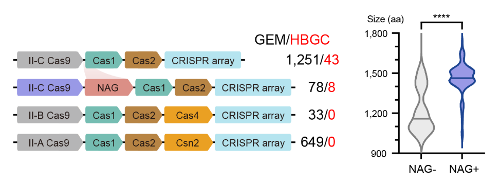 通过生物信息学分析,研究团队观察到一类新型关联基因(Novel-associated genes, NAGs),显著富集存在于较大蛋白体积的II-C型Cas9的基因簇中,并推测这些NAGs可能参与到Cas9介导的细菌免疫过程中。