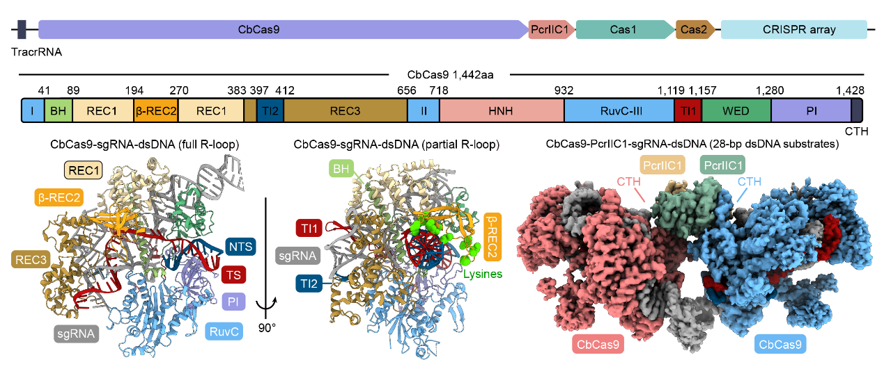 图3. CbCas9效应蛋白结构(左)和CbCas9-PcrIIC1复合体结构(右)
