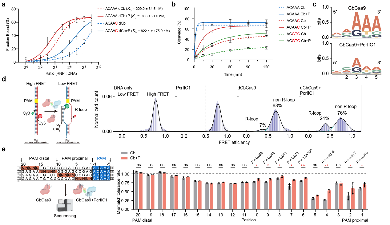 图4. PcrIIC1增强CbCas9的DNA结合(a)、切割(b)、PAM兼容性(c)、DNA解旋(d)和错配容忍(e)能力