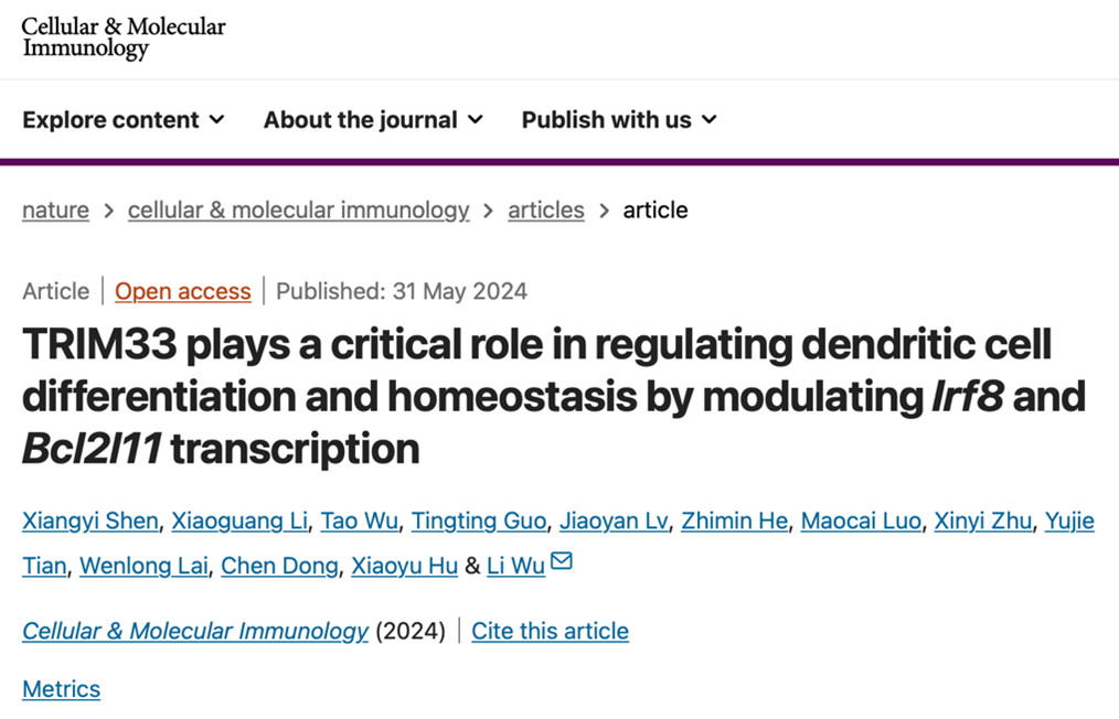 生命中心吴励课题组在2024年5月31日的《Cellular & Molecular Immunology》期刊上在线发表了题为“TRIM33通过对Irf8与Bcl2l11转录的调控在树突状细胞的分化与稳态中发挥重要作用”(TRIM33 plays a critical role in regulating dendritic cell differentiation and homeostasis by modulating Irf8 and Bcl2l11 transcription)的研究论文。该研究首次报告了TRIM33通过促进Irf8表达以支持cDC1发育,同时通过抑制Bcl2l11在所有DC亚群及其前体中的表达,在维持DC的稳态中起到关键作用。
