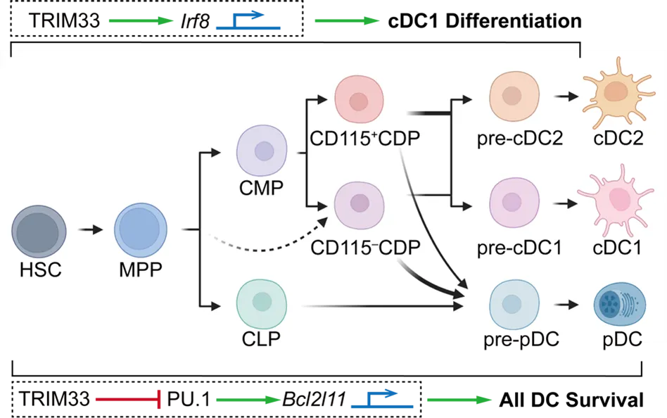 作为免疫系统中重要的调控细胞,树突状细胞(dendritic cells,DC)的稳态对于维持机体的先天和适应性免疫反应至关重要[1]。本项研究在课题组既往鉴定的调控DC发育分化的关键转录因子和表观遗传修饰因子[2-5]的基础上,确定了TRIM33作为调控DC分化和生存的又一新的调节因子的重要功能。